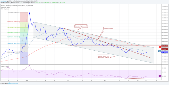 Xu hướng hiện tại sẽ chạm đường EMA 20 ngày và cao hơn mức 0.27 USD. Nếu những con bò không thể vượt qua được hai mức này thì mức giá cặp XLM/USD có thể trượt xuống mức 0.16 USD và sau đó có thể là 0.11 USD.