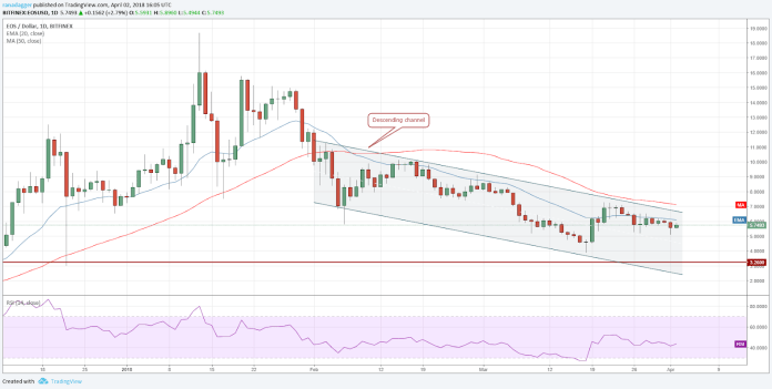 Nếu cặp EOS/USD phá vỡ đường EMA 20 ngày, đường kháng cự của kênh giảm dần và SMA 50 ngày, thì nó sẽ trở nên tích cực.