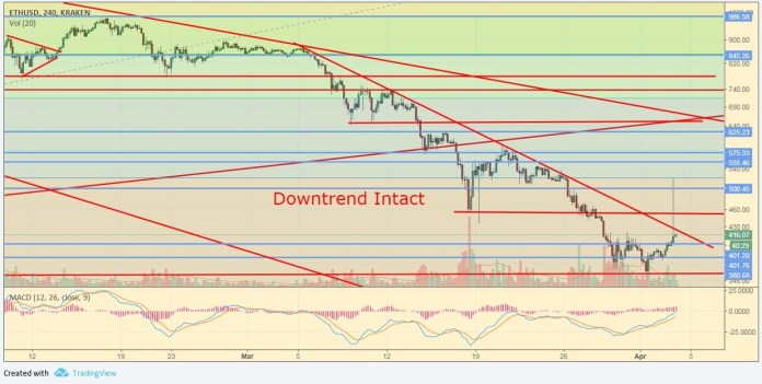 Nhìn từ góc độ kỹ thuật, Ethereum đang tỏ ra yếu thế hơn so với BTC và các Altcoin khác, vì cho đến thời điểm hiện tại nó vẫn đang bị mắc kẹt quanh ngưỡng 400 USD, và xu hướng giảm ngắn hạn vẫn đang còn chiếm ưu thế