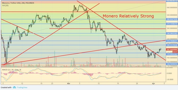 Xét từ góc độ kỹ thuật Monero vẫn còn khá mạnh so với các đồng coin khác, nó đang giao dịch cao hơn mức thấp của tháng 2 và tháng 3 và đường xu hướng giảm trước đó. Tuy nhiên, đối với Monero nó vẫn là trung lập, vì đồng tiền số này vẫn chưa tìm thầy một xu hướng tăng ngắn hạn mới nào.