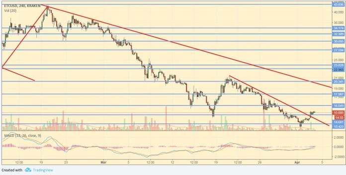 Ethereum Classic đã phá vỡ mức thấp trong tháng 2 vào cuối tuần này, nhưng hiện tại nó đang phục hồi trên mức thấp này và mức thấp của tháng 3, với mức giao dịch xung quanh ngưỡng 14.50 USD. Đồng tiền số này vẫn đang nằm trong xu hướng giảm điểm rộng hơn mặc dù đã phá vỡ xu hướng ngắn hạn hiện tại, và nó vẫn chỉ là trung tính theo mô hình xu hướng ngắn hạn.