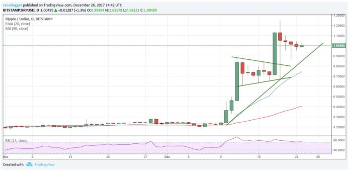 Ripple đã có sự sụt giảm vào ngày 22 tháng 12, nhưng nó nhận được ngưỡng hỗ trợ mạnh ở mức 0.67 USD. Từ đó, nó đã tăng 57% và đóng cửa ở mức 1.05398 USD.