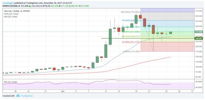 Vào ngày 22 tháng 12 Litecoin đã có sự sụt giảm đáng kể dưới mức hỗ trợ là 240 USD, tuy nhiên nó nhanh chóng phục hồi và đóng cửa trên mức này.