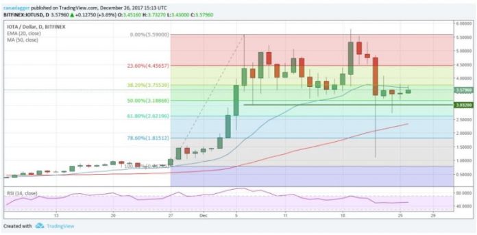 Kể từ ngày 6 tháng 12, IOTA vẫn duy trì xung quanh ở mức đáy 3.032 USD đến 3.4 USD và đỉnh là 5.59 USD. Nỗ lực duy trì giá dưới ngưỡng hỗ trợ đã không thành công.