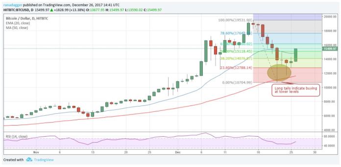 Vào ngày 22 và ngày 24 tháng 12, sức mua mạnh vào giảm từ 13.000 USD đến 11.000 USD, dẫn đến sự hình thành đuôi dài trên nến.