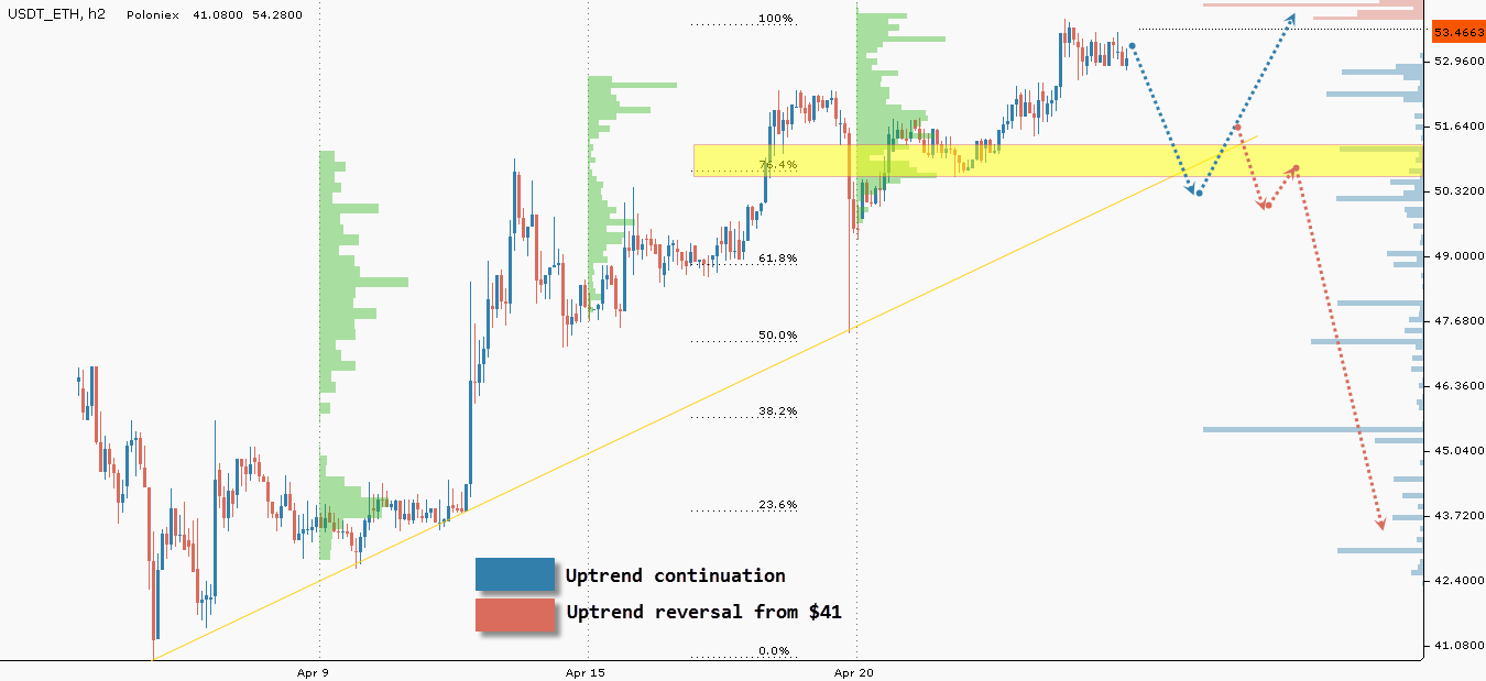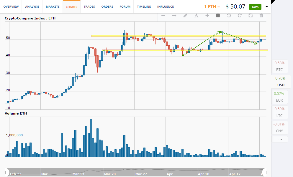 Giá Ethereum giữ thăng bằng tại giới hạn trên của khoảng từ 40$ đến mức 50$. Đã có nỗ lực trong việc thiết lập một đợt sóng đảo chiều theo hướng đi lên vào ngày 18/4, nhưng điều đó đã không trở thành hiện thực. Khối lượng giao dịch bán cao hơn nhiều so với khối lượng mua, điều này đã dẫn tới việc giá giảm xuống 48$, điều khởi đầu của làn sóng này. Giá của ethereum lại một lần nữa đã đạt điểm đổi chiều. Liệu nó có thể đảo ngược tình thế trong khoảng thời gian này?
