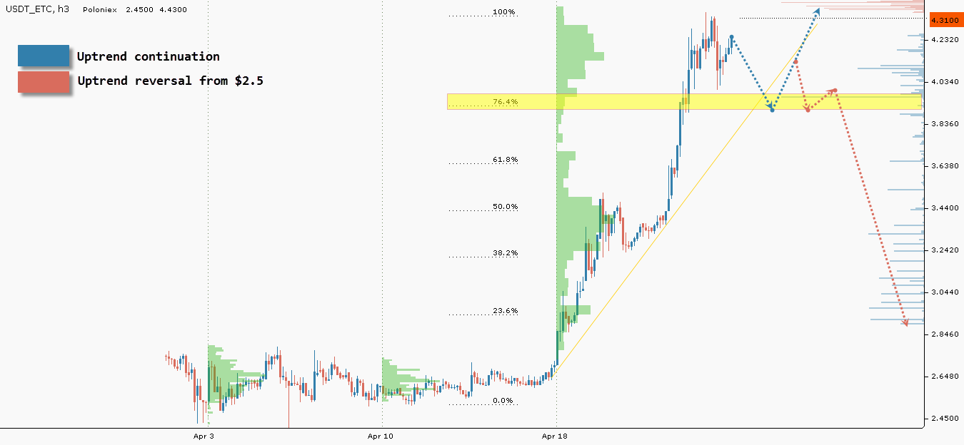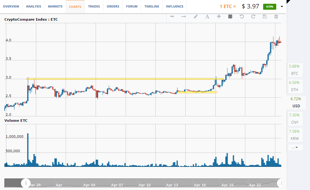 Như đã dự đoán trước, đã có một sự dịch chuyển với quy mô lớn hơn. Sau khi củng cố ở mức 2,6$, Ethereum classic đã thiết lập một đợt “tăng thẳng đứng”. Một kịch bản tương tự được lặp lại một lần nữa sau khi nó đạt đỉnh tăng trưởng tại 3 USD, đó cũng là tín hiệu cuối cùng trước khi tăng đến 3,5 USD. Ethereum classic đã phá vỡ kỉ lục của chính mình năm ngoái.