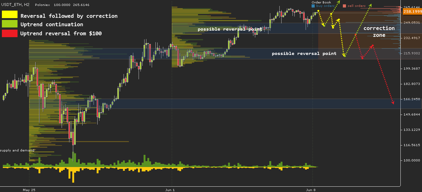 Bất chấp sự thật là giá đã sụt giảm đến gần 50% nhưng nhu cầu đối với Ethereum lại không ngừng gia tăng. Nhờ sự tín nhiệm ở mức $170 đó mà đã giúp ETH có thể phục hồi và duy trì đà tăng trưởng dài hạn của mình. Sau khi làn sóng người bán xuất hiện tại đỉnh của đợt tăng trưởng, xung quanh khu vực $200-$220 thì giá Ethereum bắt đầu cố thủ, hình thành nên một mốc chính $210. Mục tiêu chiến lược này có ý nghĩa rất quan trọng vì nó được bảo vệ bởi nhiều lệnh mua vào lớn và vì thế, ít có khả năng giá sẽ hạ xuống thấp hơn con số trên. Do đó, nếu Ethereum gặp phải chỉnh giá tại $240 thì điểm thấp nhất mà giá có thể đạt là $210. Nếu nhu cầu lại xuất hiện ở khu vực đó, đà tăng trưởng nhiều khả năng sẽ được tiếp tục.