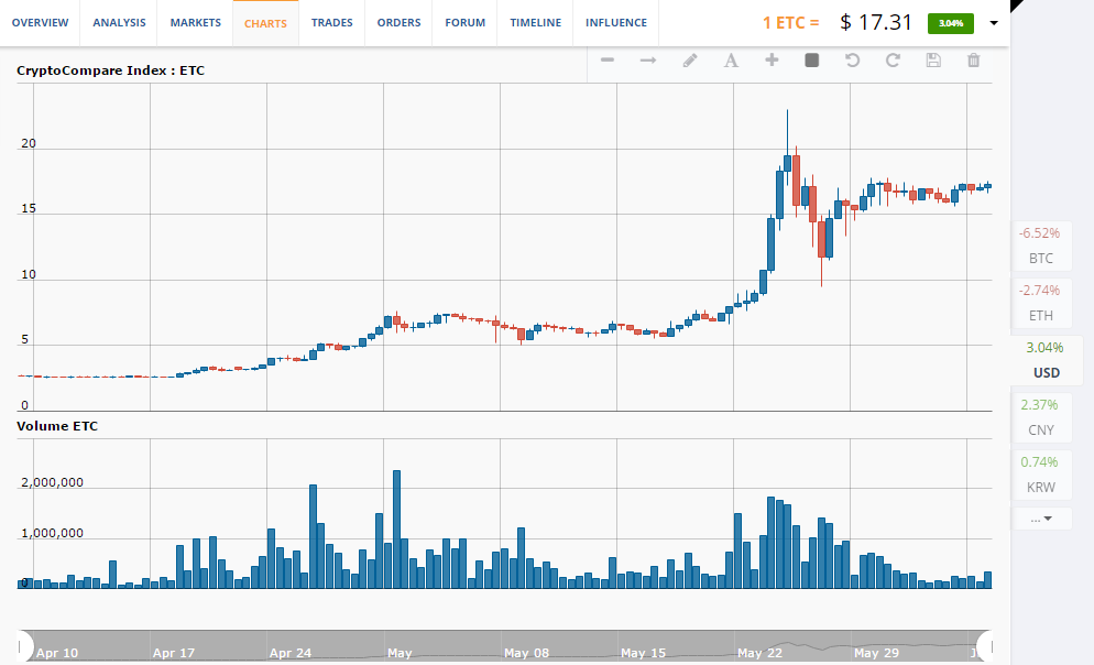 Cán cân giữa cung và cầu là yếu tố dự đoán bản chất của biến đổi giá. Như chúng ta có thể thấy được ở đồ thị phía dưới, mức cung và cầu gần như đã bằng nhau trong suốt quá trình ổn định, vốn chính là nguyên nhân cho sự phát triển dang ngang này. Bắt đầu từ ngày 4/6, ta có thể nhìn rõ đã có chút gia tăng trong nhu cầu, tạo điều kiện đẩy giá lên. Một ngưỡng kỹ thuật gần $16 là quan trọng bởi vì đó nhiều khả năng sẽ là nơi hầu hết người bán sẽ hoạt động. Nếu giá không đảo chiều ở đó mà nhu cầu vẫn duy trì thì Ethereum Classic sẽ có thể tăng vượt qua $22.