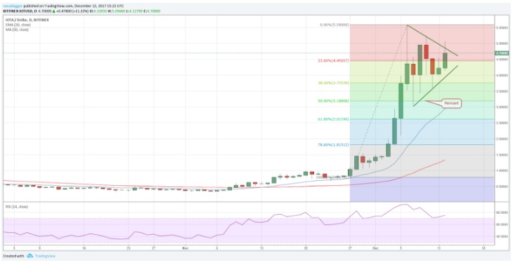 Sau gần 5 tháng rưỡi, IOTA có sự sụt giảm nhẹ vào hồi cuối tháng 11. Tuy nhiên, nó nhanh chóng hồi phục từ mức thấp 0,78735 USD vào ngày 27 tháng 11 lên mức cao 5,59 USD vào ngày 6 tháng 12, với mức tăng 609%.