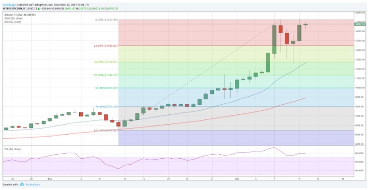 Fibonacci retracement đạt mức 38,2%. Từ mức thấp nhất là 12.505 USD vào ngày 10 tháng 12 đã tăng khoảng 39% lên mức cao nhất là 17.389 USD vào ngày 11 tháng 12.