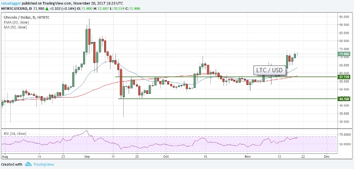 Chúng tôi đã đề xuất một mức giá tiếp theo là 60,4 USD vào ngày 13 tháng 11, khi mà Litecoin đã vượt ra ngưỡng phạm vi từ 44 USD đến 57 USD.