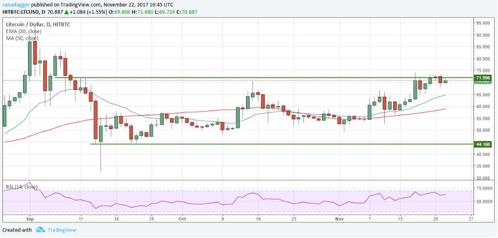 Các nhà đầu tư của chúng tôi đang thực hiện các vị trí dài hạn từ mức 60.4 USD, chúng tôi đã khuyến nghị nên đầu tư 50% lợi nhuận ở mức 71 USD. Tuy nhiên, trong năm ngày vừa qua Litecoin đang gặp một số khó khăn khi không thể bứt phá lên mức 72 USD.