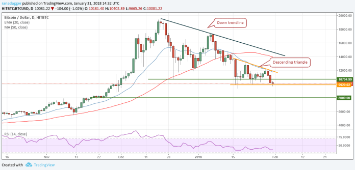 Hôm qua 31/01, lần đầu tiên Bitcoin đóng cửa dưới mức đáy của ngày 22 tháng 12 là 10.705 USD. Điều này cho thấy mức cắt lỗ đã ở những mức thấp hơn.