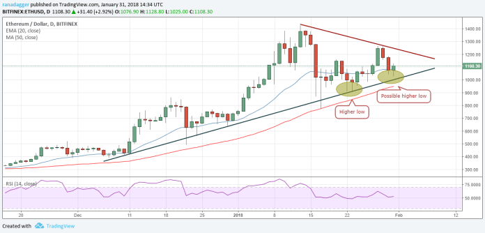 Ethereum vẫn đang được giao dịch trên đà xu hướng tăng, cặp ETH/USD vẫn đang rất lạc quan bởi vì nó tiếp tục tạo đáy ở mức đáy cao hơn mức đáy cũ. Một xu hướng mua vào tương đối ổn định, cho nên giá có thể còn tiếp tục tăng.