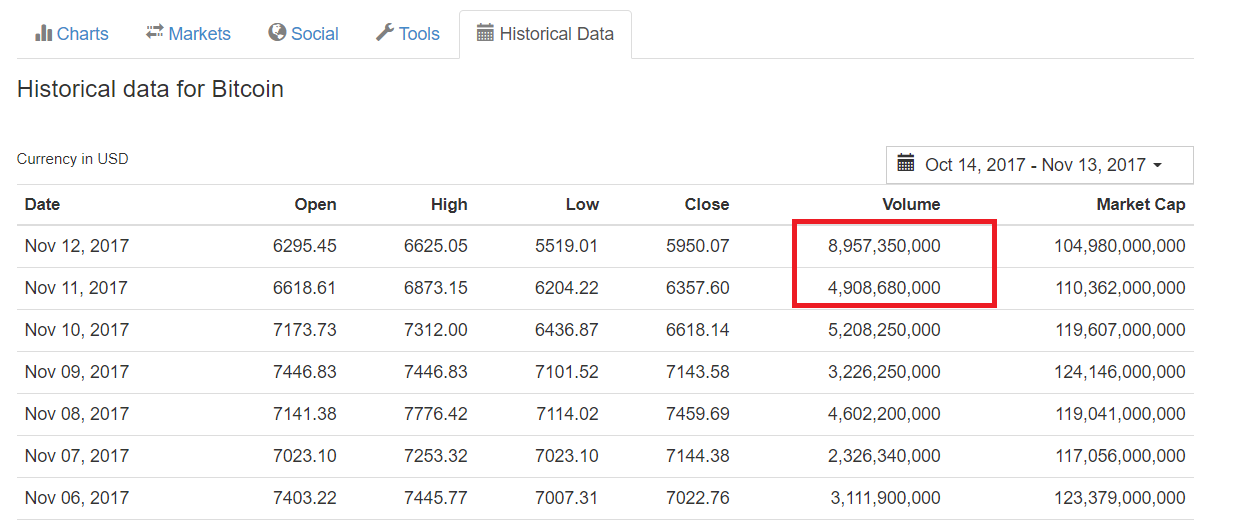 Sự tăng vọt lưu lượng mua bán trao đổi Bitcoin trong ngày Chủ nhật hôm qua (12/11), dữ liệu lấy từ CoinMarketCap