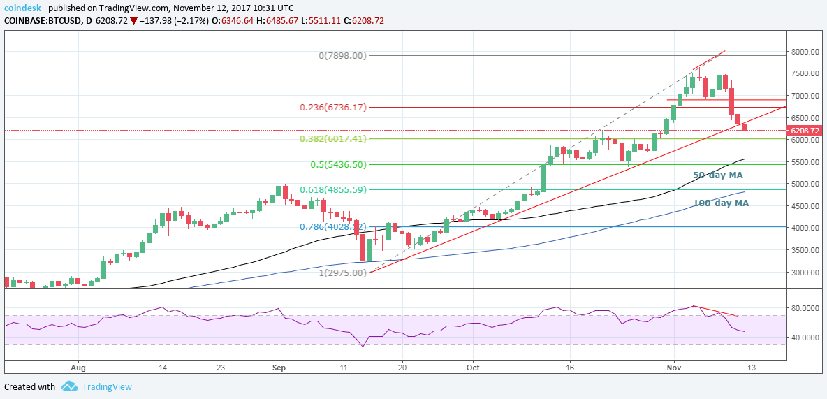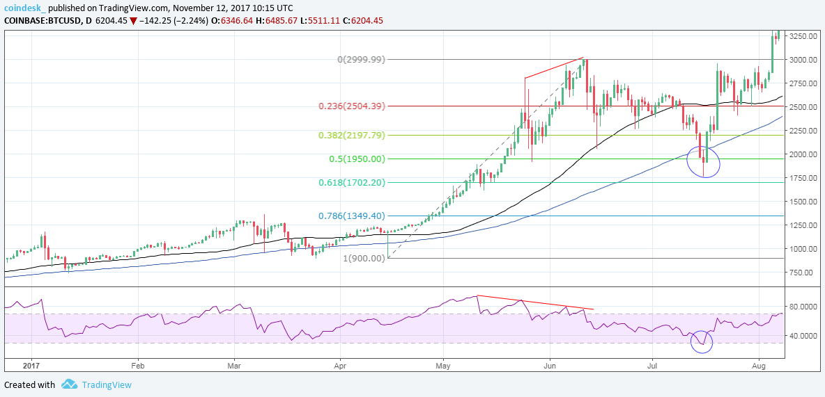 Nếu lần mất giá này cũng giống như hai trường hợp trên, giá Bitcoin sẽ chạm đáy trong khu vực từ mức 61,8% Fibonacci retracement ($4,855.59) đến nằm dưới đường trung bình động 100 ngày ($4,818). Trong một vài ngày tới, đường MA 100 ngày có thể sẽ dốc lên khu vực $5,000 – $5,100.