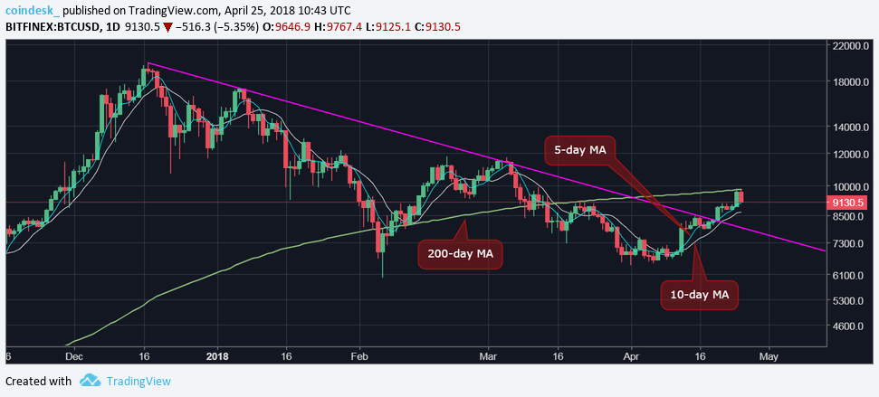 Đồng tiền điện tử số 1 thế giới hồi sớm hôm nay, thứ Tư ngày 25/04, đã có lúc chạm đến mốc $9,767 trên sàn Bitfinex – ngưỡng giá trị cao nhất kể từ ngày 12/03 – trước khi giảm lại về khu vực $9,100 chỉ nửa ngày sau. Tại thời điểm thực hiện bài viết, BTC đang được trao tay với mức giá $9,176/đồng.