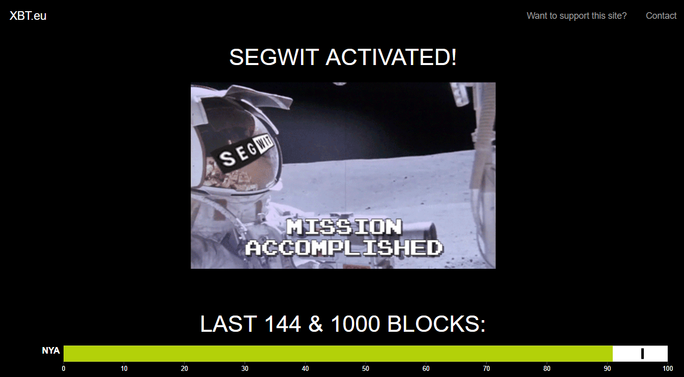Sau hơn một năm rưỡi tranh cãi và thất bại tại các hội nghị bàn tròn, một cuộc gặp mặt khác mang tên “Thoả thuận New York” (NYA) diễn ra hồi tháng 5 năm nay đã thúc đẩy mọi chuyện một cách vượt bậc. Thoả thuận trên đề xuất rằng SegWit sẽ được triển khai nếu như nhận được sự ủng hộ bởi đa số năng lực khai thác và theo sau đó là một đợt hard fork 2 MB. NYA đã dẫn đến sự ra đời của đội ngũ xây dựng SegWit2x, đứng đầu là chuyên gia đời đầu kiêm nhà phát triển Jeff Garzik. SegWit2x và giới thợ đào đã cùng nhau giúp SegWit được chốt phương án triển khai vào ngày 8/8 tại block thứ 479707. Theo sau đó, vào sáng nay, hội thợ đào BTCC.com đã xử lí thành công blocks số 481824 và SegWit chính thức được triển khai trên toàn mạng lưới Bitcoin. Cách đây hai ngày, SegWit đã chia sẻ cảm xúc trước viễn cảnh SegWit rốt cuộc cũng sẽ được kích hoạt, nhấn mạnh: