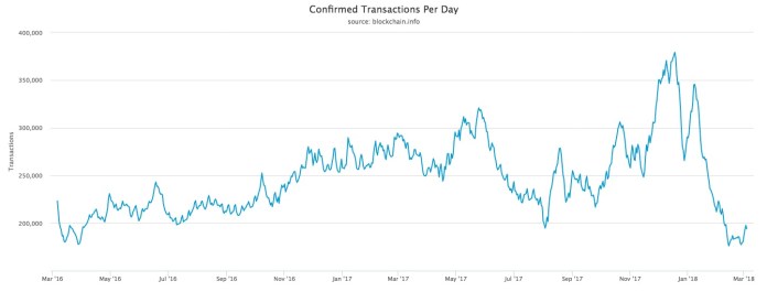 Theo Blockchain.info, hoạt động giá cả đi ngang của Bitcoin đã dẫn đến số lượng giao dịch mỗi ngày được xác nhận là thấp nhất kể từ tháng 3 năm 2016. Dữ liệu cho thấy các giao dịch BTC đã giảm xuống đáng kể từ hồi tháng 12 năm 2017.