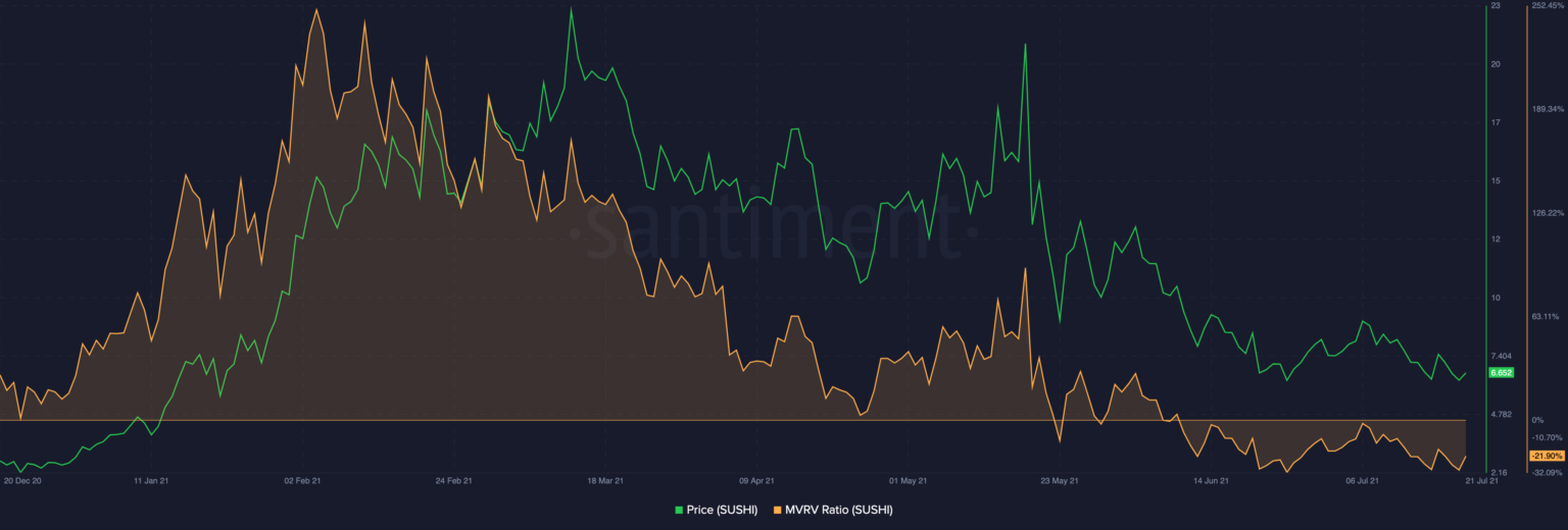 Ở giai đoạn này, không quá khi nói rằng SUSHI bị định giá thấp. Tỷ lệ MVRV (giá trị thị trường so với giá trị thực tế) trượt dài dưới 0 tại thời điểm viết bài đã hỗ trợ thêm cho tuyên bố nói trên.