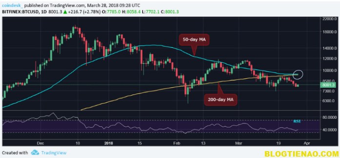 Một “death cross” xảy ra khi đường trung bình ngắn hạn 50 ngày (MA) cắt xuống đường trung bình dài hạn 200 ngày (MA) (sự giao nhau trong xu hướng giảm), cho thấy giá sẽ giảm sâu hơn. Như đã thấy trên biểu đồ hàng ngày của Bitcoin bên dưới, đường MA 50 ngày có vẻ sẽ cắt xuống đường MA 200 ngày một cách nhanh chóng.