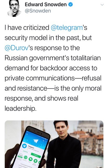 Ông Edward Snowden, người ủng hộ an ninh dữ liệu người dùng và ẩn danh, tỏ ra tức giận về hoạt động của RKN trong bài phát biểu ngày 17 tháng 4: “trước đây, tôi đã chỉ trích mô hình bảo mật của Telegram, nhưng phản ứng của Durov với yêu cầu chuyên chế của chính phủ Nga đối với việc tiếp cận thong tin từ xa – từ chối và đối kháng – là phản ứng đạo đức duy nhất và cho thấy anh ấy là một người lãnh đạo thực sự.”