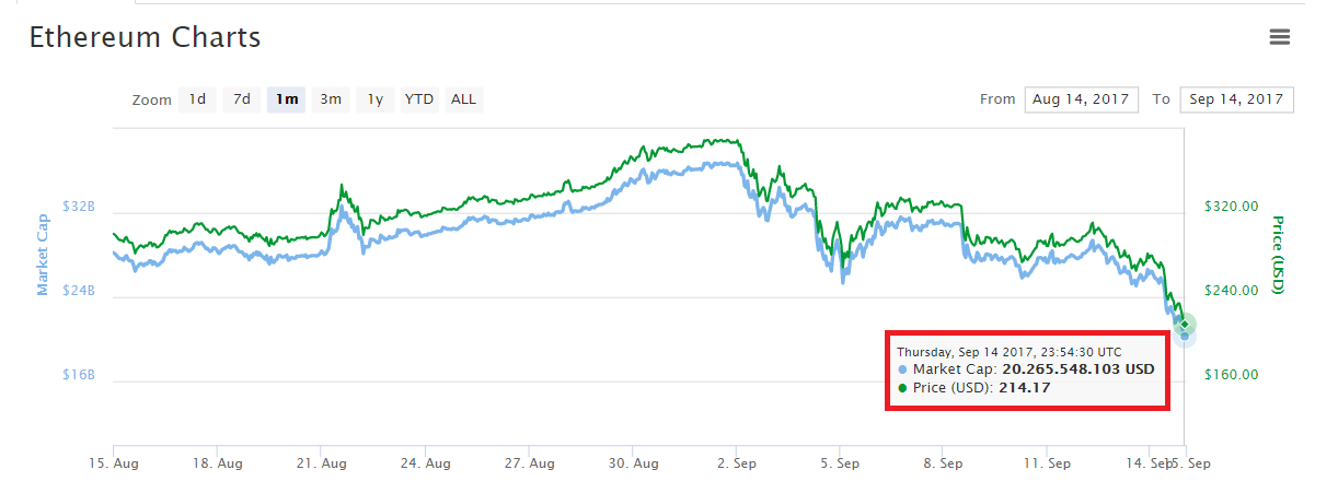 Giá trị đồng tiền điện tử số 2 thế giới là Ethereum cũng đã giảm sâu trong ngày hôm qua, hiện đang ở mức $215/đồng. Đây là con số thấp nhất của ETH kể từ ngày 5/8, tương đương với giảm 42% so với mức cao mà nó vừa thiết lập trong tháng 9 này. Vốn hoá thị trường của nó chỉ còn 20 tỉ USD mà thôi.