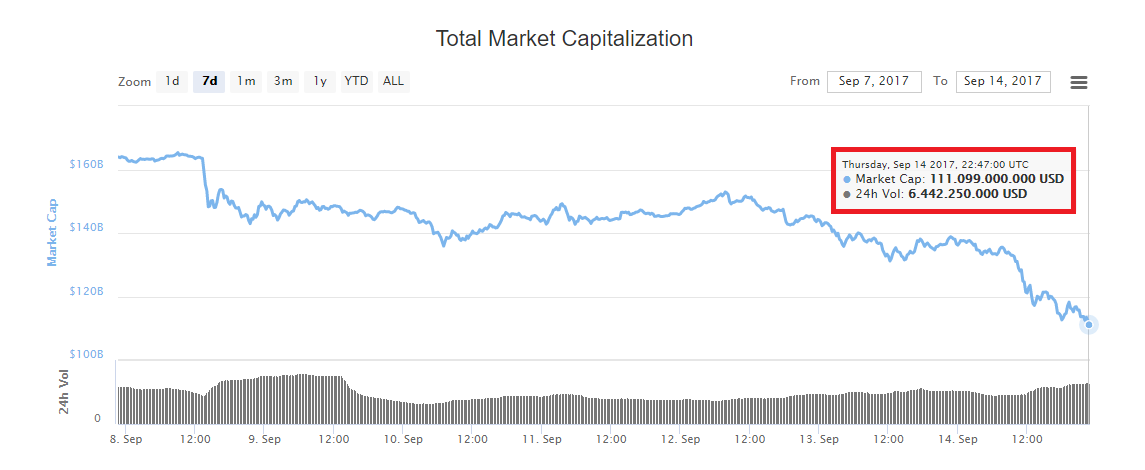 Sự suy giảm trầm trọng của vốn hoá thị trường tiền điện tử trong một tuần qua, theo thống kê của CoinMarketCap