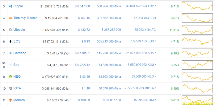 Trong khi một số đồng coim nhỏ như Steem và VeChain có hiệu suất tăng trưởng cao hơn Bitcoin với giá trị gia tăng khoảng 50% và 25%, thì các đồng coin lớn bao gồm Bitcoin, Ethereum, Ripple, Bitcoin Cash, Litecoin và EOS đã hoạt động tốt trong vài ngày qua.