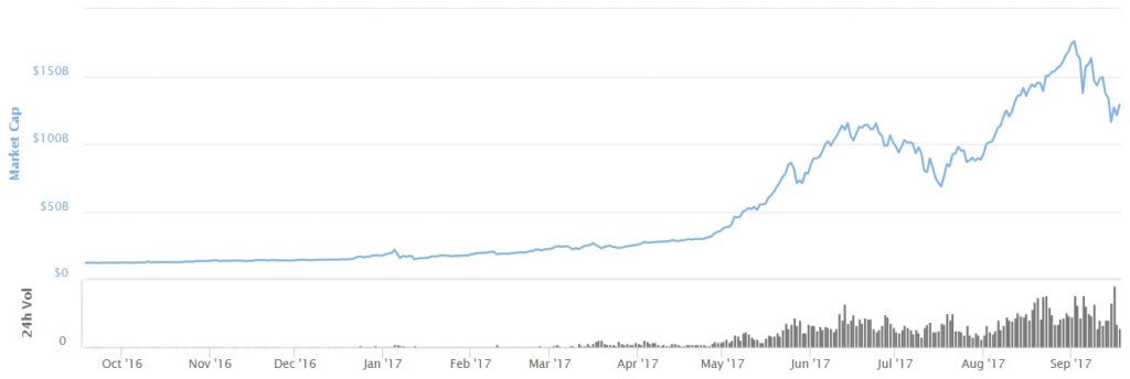 Theo Coinmarketcap, tính đến đầu hôm thứ hai (18/9/2017) tổng giá trị của tất cả các đồng tiền mật mã đã bắt đầu ổn định ở mức 125 tỷ USD. Hôm thứ 6 tuần trước con số này đã giảm xuống còn 97,55 tỷ USD, giảm mạnh so với mức 179 tỷ USD chỉ hai tuần trước đó.