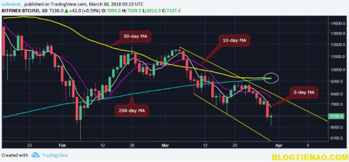 Hiện tại, MA 50 ngày nằm ở mức 9.376 USD và MA 200 ngày nằm ở 9.347 USD. Do đó, death cross (sự cắt nhau giữa đường MA 50 ngày và MA 200 ngày), sẽ xảy ra trong 24 – 48 giờ tới. Như bài viết về death cross trước đó, sự cắt nhau này báo hiệu cho một đợt giảm giá nhưng có thể đây là một cái bẫy của thị trường và sẽ có xu hướng tăng giá nếu RSI cho thấy điều kiện vượt bán.