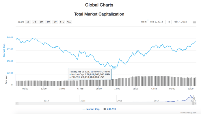 Sau khi trượt xuống mức giá thấp nhất là 6,094 USD vào thứ ba ngày 6 tháng 2, Bitcoin đang hồi phục đáng kể vào thứ tư 7 tháng 2, đẩy giá Bitcoin lên hơn 8.000 USD, kéo top 100 đồng tiền ảo về giá trị vốn hóa ban đầu.