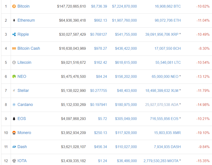 Hiện tại các đồng tiền số đang bị xu hướng giảm bao trùm, thị trường tiền ảo chiềm trong sắc đỏ. Trong đó Bitcoin đã phá ngưỡng dưới 9.000 USD lần đầu tiên trong 1 tháng, kéo theo giá trị vốn hóa xuống còn 148 tỷ USD, khối lượng giao dịch trong 24h cũng giảm còn khoảng hơn 7 tỷ USD.