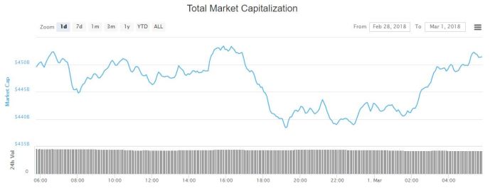 Vốn hóa thị trường tiền ảo đã bưới vào ngày thứ năm ở mức 449.6 tỷ USD. Sau khi chạm đáy ở mức 440 tỷ USD, chỉ số này đã phục hồi nhẹ vào sáng thứ năm. Đến sáng hôm nay, thị trường đang ở mức 453 tỷ USD, tăng khoảng 1% trong 24 giờ qua.