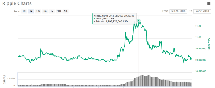 Ripple (XRP) cũng giảm từ mức cao trong tuần 1.08 USD xuống mức 0.85 USD, giảm hơn 8% trong vòng 24 giờ. Sự tăng đột biến hôm 6/3 có thể là do việc công bố 61 tập đoàn Nhật bản phát hành ứng dụng thanh toán qua di động tức thì được hỗ trợ bởi Ripple.