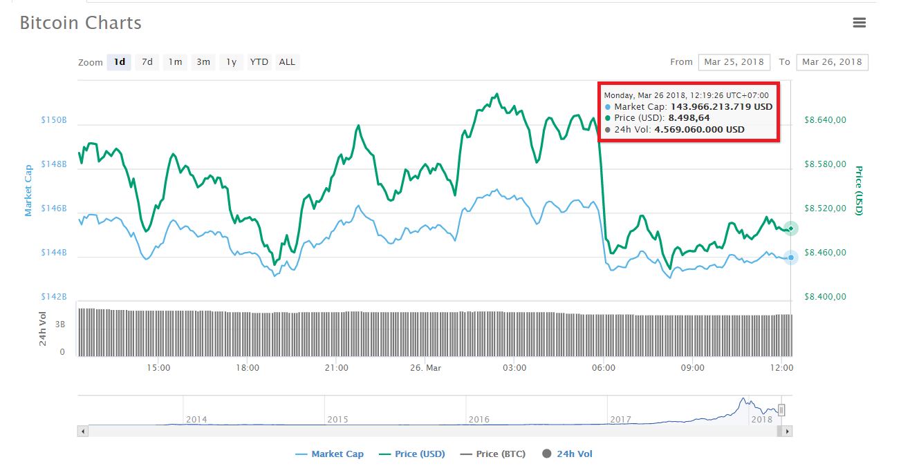 Kể từ ngày 25/03, hai đồng tiền thuật toán số 1 và số 2 thế giới là Bitcoin và Ethereum gần như chẳng ghi nhận mức tăng lẫn giảm đáng kể nào. Giá BTC trong 24 giờ qua chỉ có một lần giảm nhẹ từ $8,580 về $8,490, tương đương hơn 1% giá trị. Lưu lượng giao dịch suốt 1 ngày qua của Bitcoin cũng chỉ đạt 4,5 tỉ USD, tuy nhiên lưu lượng của Ethereum còn thấp con số này đến 3 lần.