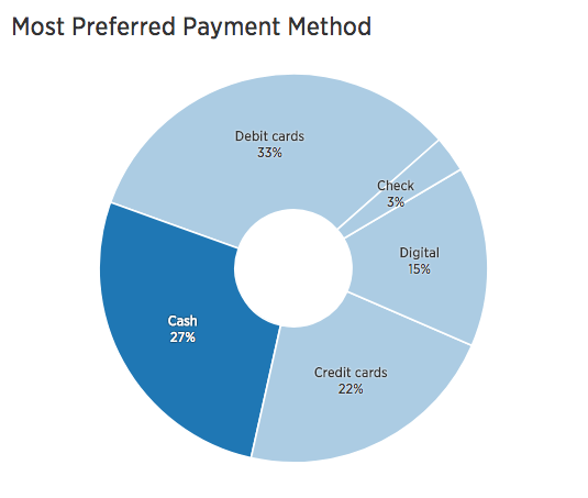 Theo một nghiên cứu tiến hành bởi Cardtronics và Edelman Intelligence, vốn đã khảo sát 1.000 người Mỹ trong hai tháng 5 và 6 vừa qua, thì đã có đến 27% trong số họ lựa chọn dùng tiền mặt, trong khi phương pháp thanh toán thẻ ghi nợ dẫn đầu với 33% lượng ủng hộ.