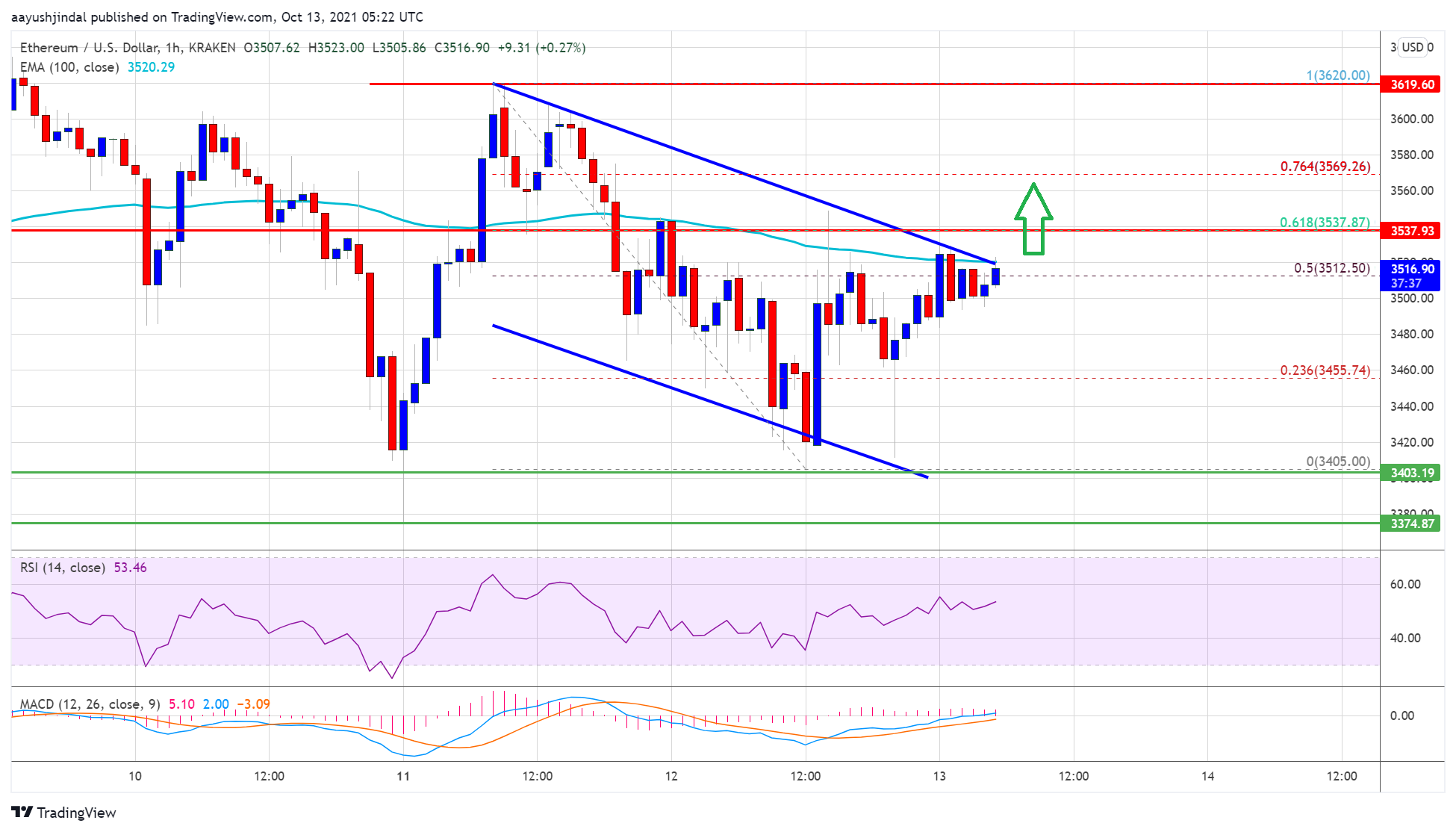 Nó hiện đang giao dịch gần $ 3.520 và SMA 100 giờ. Cũng có một kênh giảm chính đang hình thành với mức kháng cự gần $ 3.520 trên biểu đồ hàng giờ của ETH/ USD.