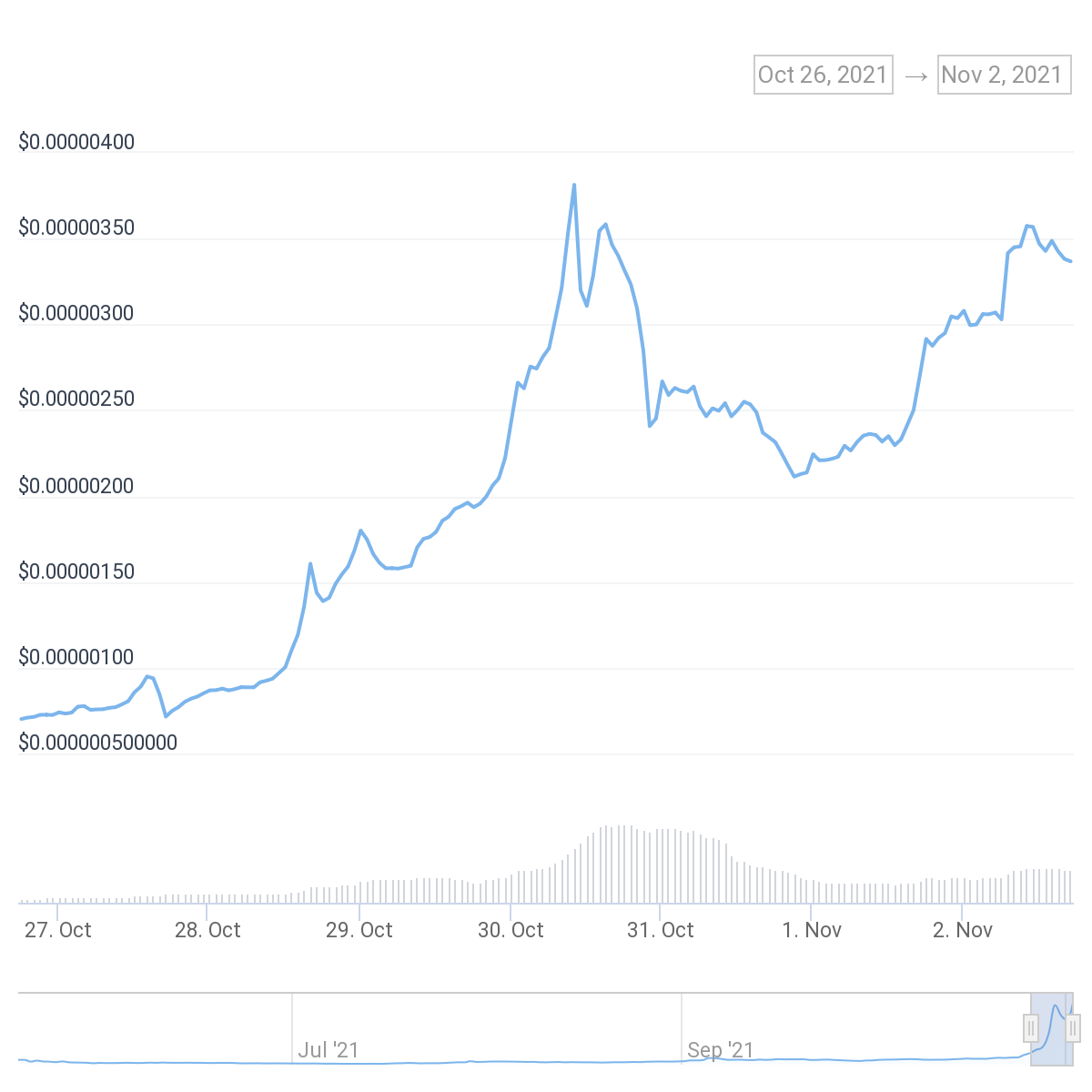 Altcoin xếp hạng thứ 190 đã bùng nổ từ mức thấp nhất trong bảy ngày là 0,000015 đô la lên mức cao nhất mọi thời đại mới là 0,000064 đô la, thể hiện mức tăng 326% chỉ trong một tuần.