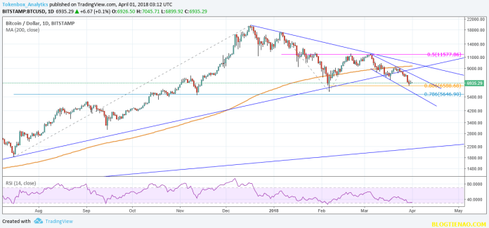 Cho đến thời điểm này, Bitcoin đã tìm thấy ngưỡng hỗ trợ tại Fibonacci 88.6% với mức thấp là 6.550 USD. Điều này có thể kích hoạt một breakout (bứt phá), giá có thể phục hồi trở lại. Tuy nhiên có khả năng bitcoin sẽ giảm xuống còn 5.920 USD, nguy cơ tiếp tục thủng đáy là khá cao. Lưu ý rằng cặp BTC/USD gần đây đã kiểm định ngưỡng kháng cự của MA 200 ngày (đường màu nâu) và nó đã đảo chiều. Thêm vào đó, giá đang giảm cao hơn đường xu hướng tăng.