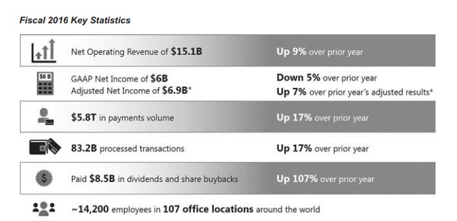 Theo báo cáo năm 2016 của Visa, mạng lưới Visa thực hiện các giao dịch trị giá khoảng 5,8 nghìn tỷ USD mỗi năm, phần lớn là từ thẻ ghi nợ (3,1 tỷ USD) và thẻ tín dụng phát hành trên toàn cầu. Hơn 83,2 tỷ giao dịch đã được xử lý trên mạng lưới Visa vào năm 2016.