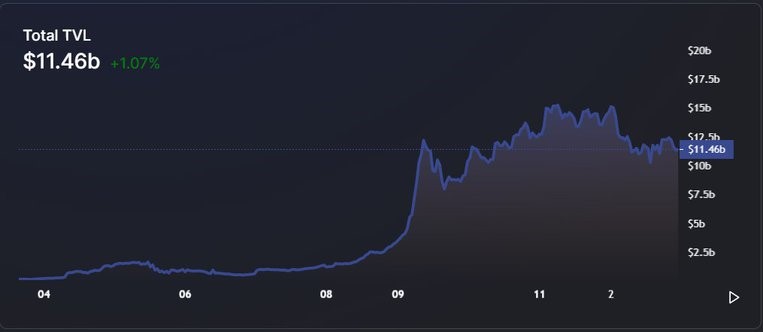 Dữ liệu từ DeFi Lama cho thấy tổng giá trị bị khóa trong Solana hiện vào khoảng 11,5 tỷ đô la, tăng gấp nhiều lần trong năm. Để so sánh, nó đạt chưa đến 150 triệu đô la vào tháng 3 năm nay.