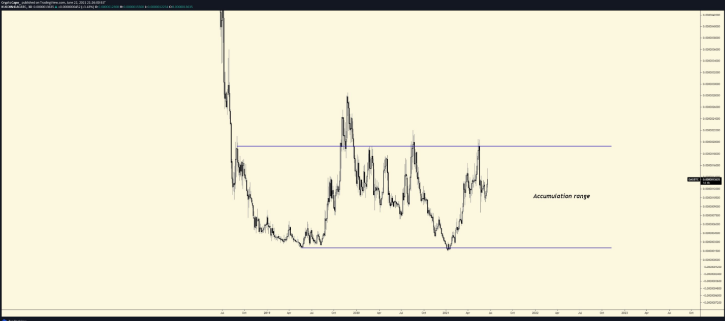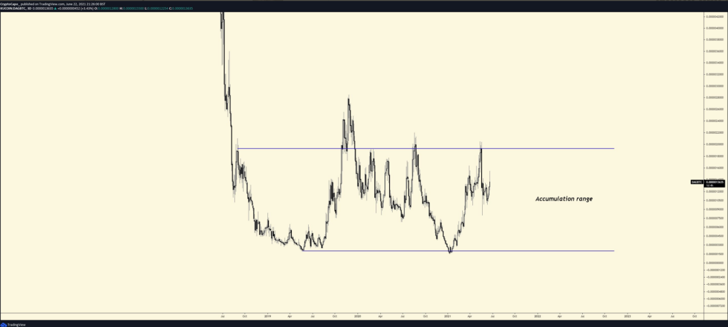 Nhà phân tích cho thấy rằng DAG đang trong giai đoạn tích lũy so với BTC, vì altcoin dao động trong khoảng 0,000002 đến 0,00000016 satoshi (sats).