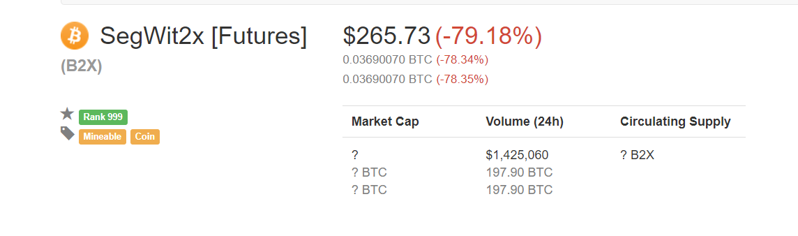 Giá trị mua bán trước token SegWit2x tại thời điểm 22:30 ngày 9/11, theo CoinMarketCap