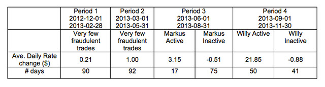 Tuy nhiên, làm thế nào để biết rằng giá bitcoin gia tăng là do các giao dịch gian lận? Bảng dưới đây cho thấy sự thay đổi giá bitcoin hàng ngày trong các khoảng thời gian khác nhau trên sàn Mt. Gox. Trong hai quý trước khi giao dịch trái phép bắt đầu, mức tăng giá hàng ngày trung bình khá tích cực nhưng tương đối nhỏ: tăng 0,21 USD trong giai đoạn đầu và tăng 1 USD trong giai đoạn thứ hai. Trong quý III, khi bắt đầu có giao dịch trái phép, giá bitcoin đã tăng trung bình 3,15 USD trong 17 ngày khi Markus tham gia, nhưng giảm trung bình 0,51 USD trong 75 ngày khi Markus không tham gia. Đến quý cuối cùng, khi Willy bắt đầu kinh doanh, sự khác biệt trở nên trầm trọng. Trong 50 ngày Willy giao dịch, giá bitcoin tăng trung bình 21,85 USD. Trong 41 ngày Willy không giao dịch, giá trung bình đã giảm 0,88 USD.