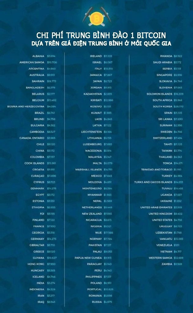 Bảng danh sách cũng cho thấy, Việt Nam, Trung Quốc là những quốc gia có chi phí đào bitcoin khá thấp với lần lượt 3.172 và 4.717 USD. Venezuela là nước có chi phí đào thấp nhất trong danh sách với 531 USD cho mỗi bitcoin được đào.