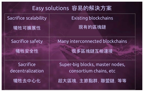 Tuy nhiên, vấn đề về mở rộng quy mô Ethereum thì có vẻ khá là nan giải. Vitalik Buterin giải thích rằng phân quyền, khả năng mở rộng quy mô và an ninh có với nhau một mối quan hệ tay ba mà trong tương lai có thể đặt ra nhiều thách thức mới. Tuy tương đối là dễ để có thể có được hai trong ba yếu tố này tồn tại trong cùng hệ thống, thế nhưng làm sao để có cả ba cùng một lúc lại là một câu chuyện hoàn toàn trái ngược.